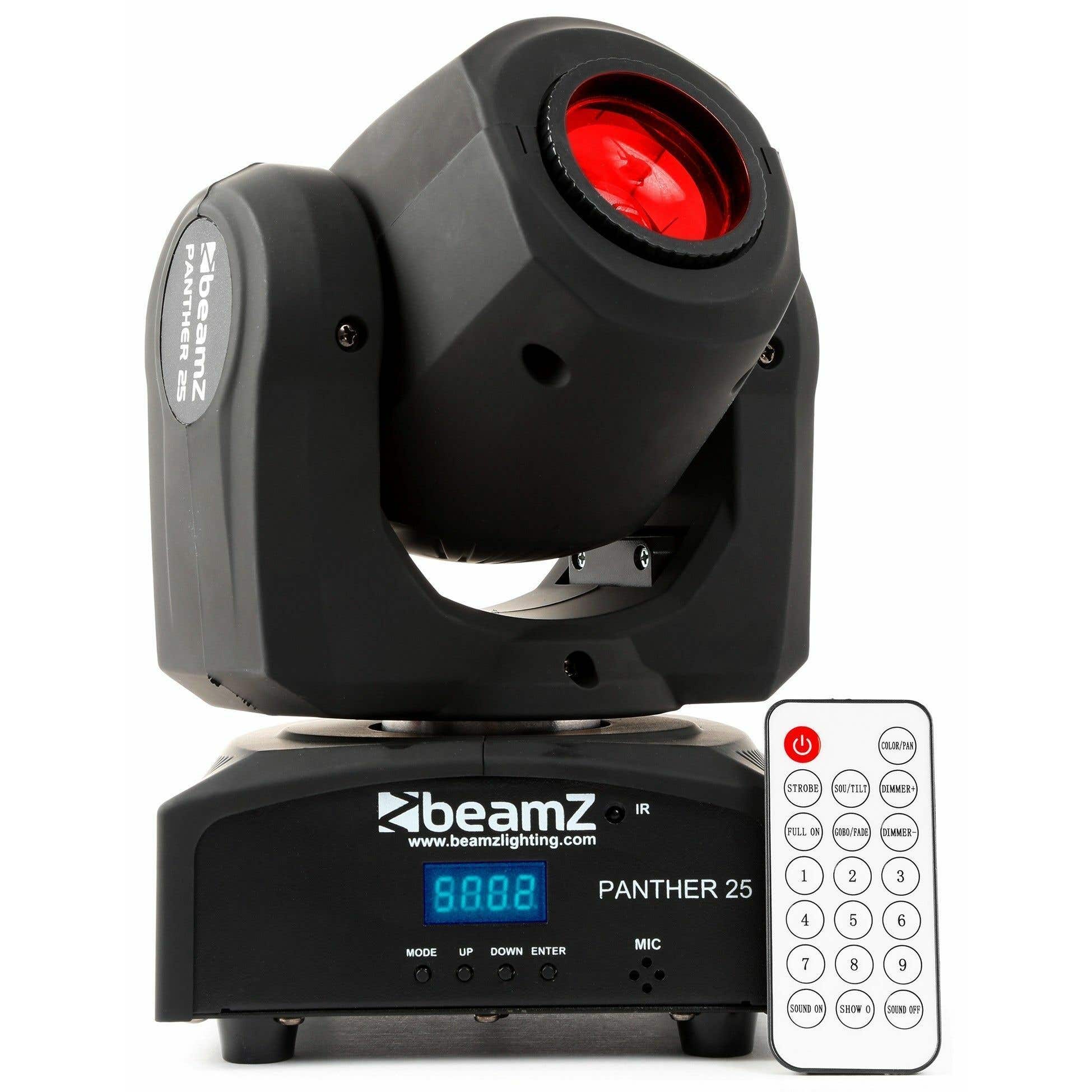Die BeamZ Panther 25 Moving Heads sind vollständig über DMX mit 5, 9 oder 11 Kanälen steuerbar. So bestimmst du selbst, wie viel Kontrolle du über Bewegungen, Farben und Effekte haben möchtest. Arbeitest du ohne Lichtpult, kannst du aus 7 integrierten Programmen wählen oder die Moving Heads über den musikgesteuerten Modus auf die Musik reagieren lassen. Mit der mitgelieferten Fernbedienung stellst du die Lampen zudem schnell und einfach ein.