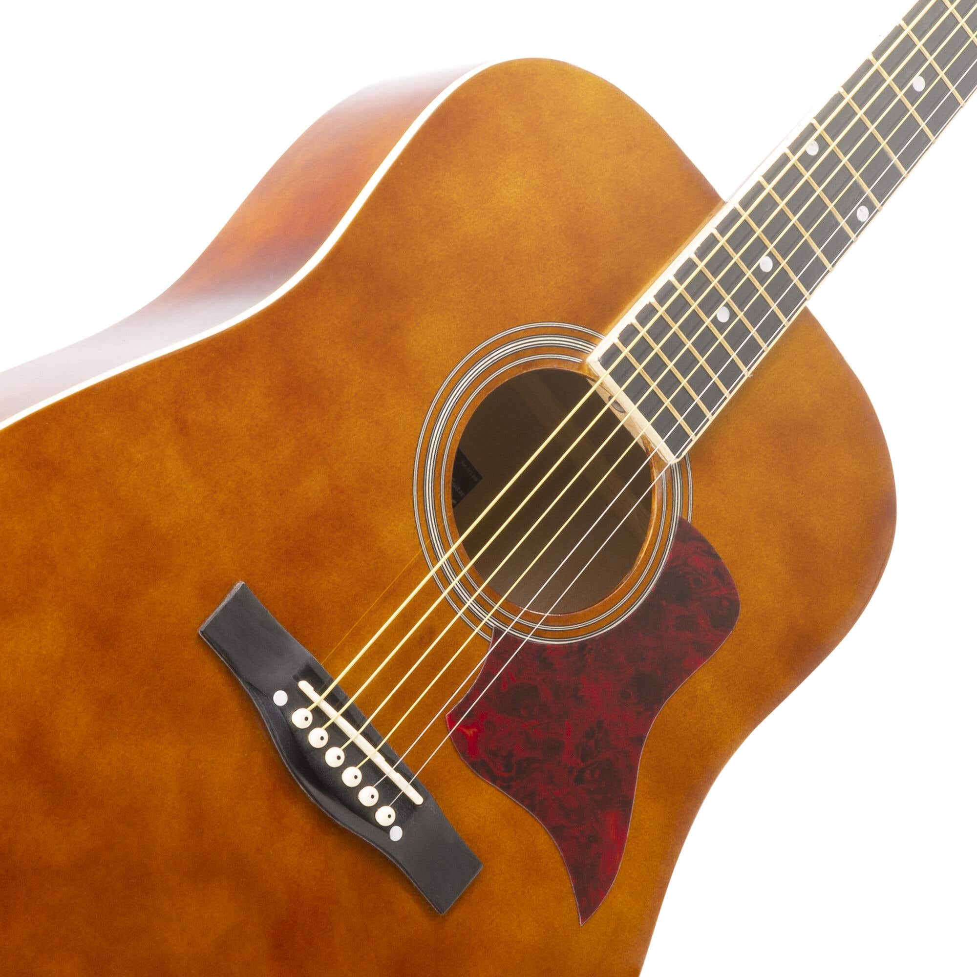 Diese Akustikgitarre mit Sunburst-Färbung ist eine sogenannte Westerngitarre. Sie werden dieses Modell mit Stahlsaiten in fast allen modernen Musikstilen sehen. Die Westerngitarre ist sowohl für Anfänger als auch für professionelle Gitarristen perfekt geeignet. Da man keinen separaten Verstärker braucht, kann man das Instrument überall spielen. So können Sie dieses Gitarrenmodell sowohl am Lagerfeuer als auch auf der Bühne (mit einem Instrumentenmikrofon) verwenden. Dank ihrer Vielseitigkeit ist die Westerngitarre unter anderem ein häufig verwendetes Begleitinstrument für den Gesang.
